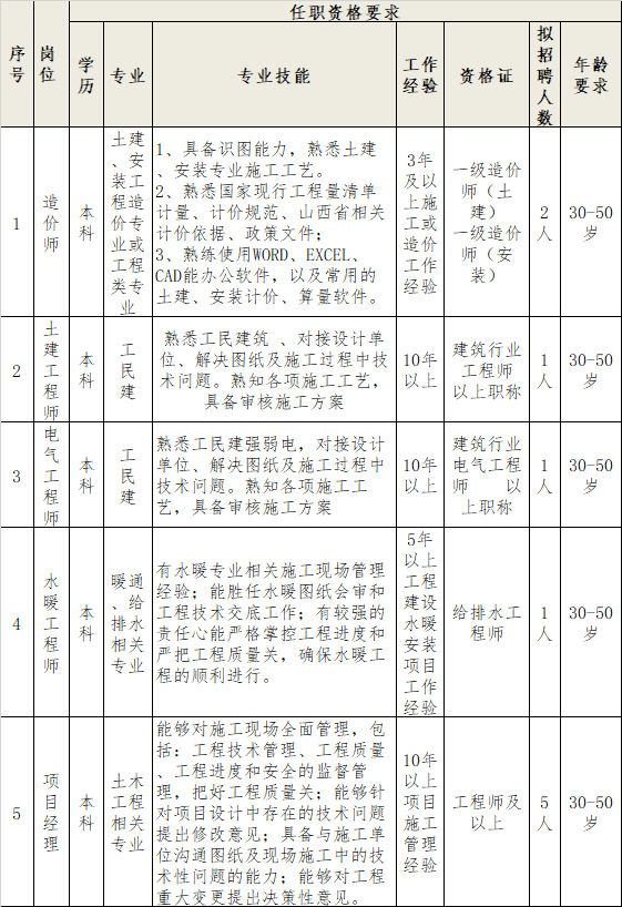 公开招聘专业技能人才,其中工程项目经理5人,土建工程师1人,造价师2人,水暖工程师1人,电气工程师1人。